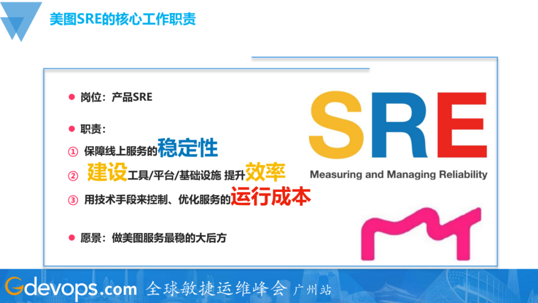 美图对SRE的愿景是做公司业务最稳的大后方。相对比PE、OP、SA这些岗位,SRE需要输出的核心价值是中间的Reliability(稳定性),同时效率和成本也需要同时兼顾。