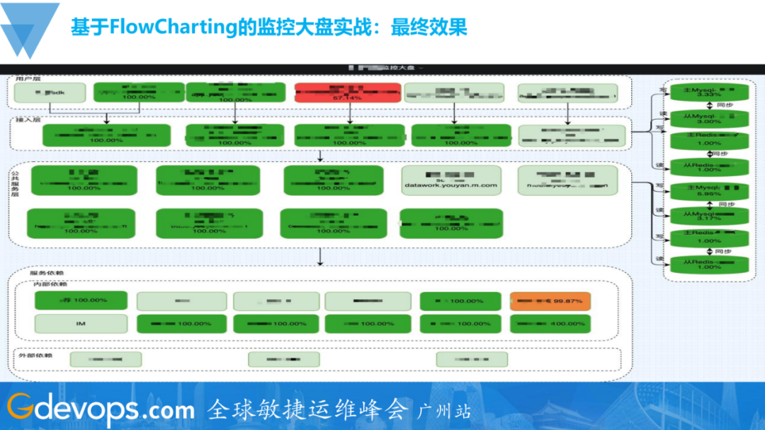 这是我们从2020年开始,基于Grafana做的一个名叫FlowCharting插件的监控大盘的实战,上图可以看到清晰看到我们这个业务完整的请求链路。具体的操作步骤,之前也有分享过,详细的实践步骤请参考:美图全链路监控实战,成本低还能直接落地