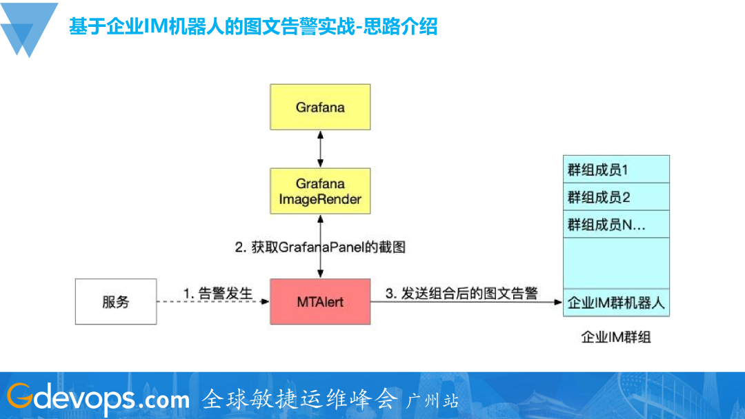 上图是我们实现思路的简图。我们中间有个叫MT-Alert的组件,是美图的统一告警平台。在这个告警平台上可以实现告警功能的扩展和定制,比如去调用一些WebHook,当收到告警的时候,我们配置去触发截取监控大盘的钩子,然后组合告警消息为图文样式,发送到企业IM。