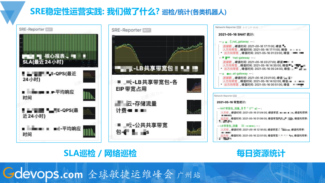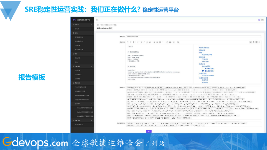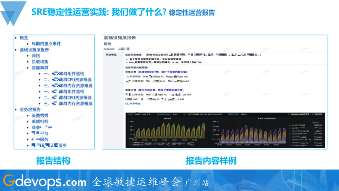 上图是我们的稳定性运营报告,我们把偏运营类的事情,系统性地整理了起来,这里其实我一直在强调一个词:运营。目前业界早已经有了这个声音:我们现在很多工作内容已经不仅仅是运维了,不仅要保证服务的稳定性,现在更重要的是以运营的视角来审视我们的工作,看哪些事情能提供更高层次的价值,然后系统性地推进这些事情。