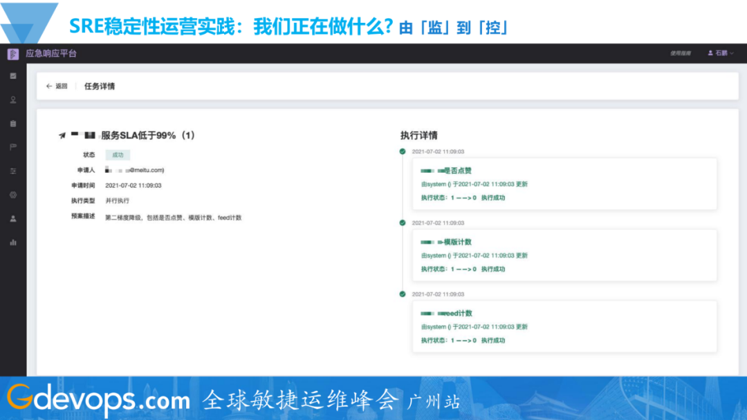 上图是一个应急响应平台执行的样例。应急响应平台就可以把我们日常对服务干预的一些手段抽象成「动作」,然后「动作」可以被组合、编排成「预案」,最后预案会应对到不同的「场景」上。当服务出现了某些异常的时候,我们就可以快速地通过这个平台去执行相应的预案去做干预,把预案推荐和预案执行入口集成到告警通知里,用来缩短MTTF(故障修复<fix>时间)。