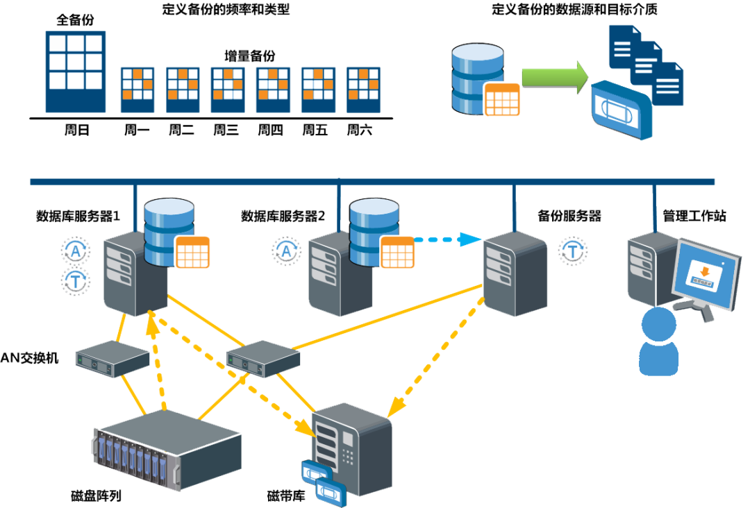0级备份+增量备份+归档日志备份,如每周六、日进行全备份,周三进行累计增量备份+每日归档日志备份,保留14天;如果需要恢复周四的数据,使用周日全量备份+周三的累计增量备份+增量备份后归档日志备份进行恢复;