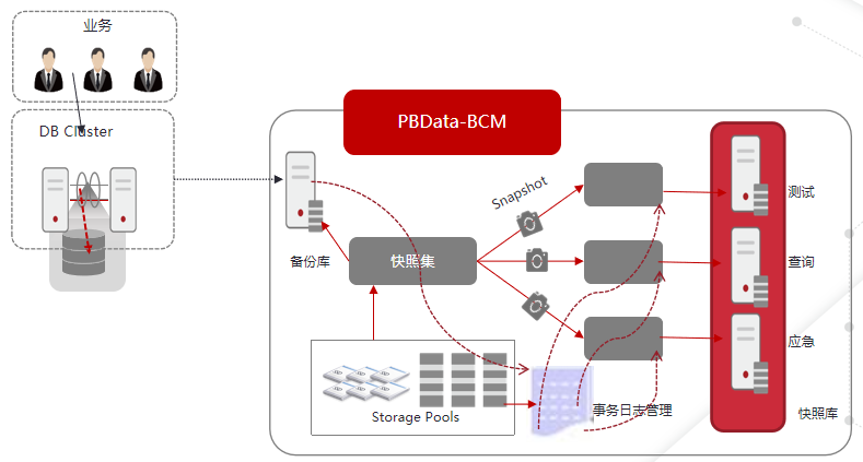 为了解决上述提出的问题,PBData-BCM备份一体机另辟蹊径,以数据库备份为基础,融合数据库日志实时备份技术、备库同步应用技术、存储快照技术与归档日志管理技术,实现对生产数据库的集中备份。