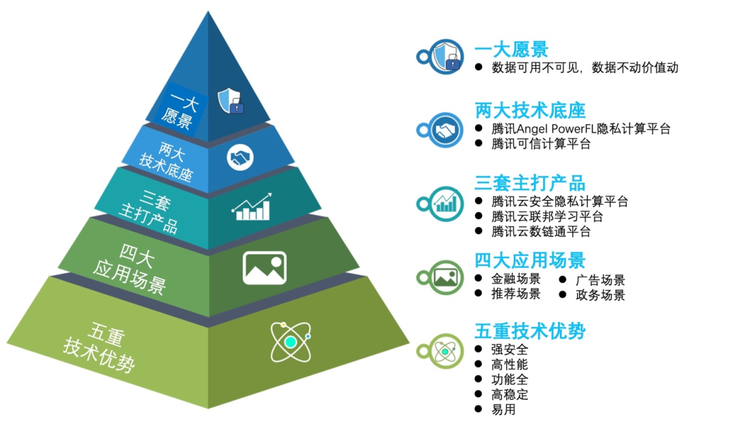 腾讯云在报告中输入了腾讯隐私计算多项产品平台的技术探索和实践内容,腾讯隐私计算的整体框架包含一大愿景、两大技术底座、三套主打产品、四大应用场景、五重技术优势。