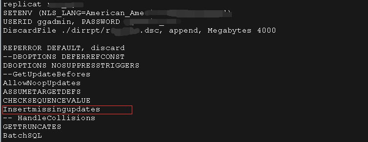 Doc ID 1144303.1 If ALLOWNOOPUPDATES is specified when the HANDLECOLLISIONS or INSERTMISSINGUPDATES parameters are being used, and if Oracle GoldenGate has all of the target key values, then Oracle GoldenGate will not ignore the update, but instead will apply it using all key columns in the SET clause and the WHERE clause (invoking APPLYNOOPUPDATES behavior). This is necessary so Oracle GoldenGate can detect if the row being updated is missing. If it is, then Oracle GoldenGate turns the update into an insert.这句官方文档的大概解释是配置了 INSERTMISSINGUPDATES参数后,update如果找不到要更新的行,那么将会装换成insert将要更新的行插入。