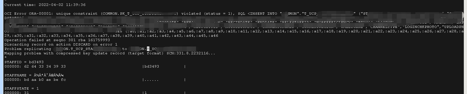 REPLICATE进程的报错日志里有问题表的ORA-00001: unique constraint主键冲突