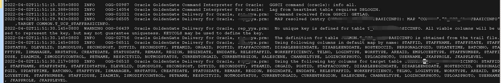 2022-04-02T11:51:30.145+0800 WARNING OGG-06439 Oracle GoldenGate Delivery for Oracle, ***: No unique key is defined for table ***. All viable columns will be used to represent the key, but may not guarantee uniqueness. KEYCOLS may be used to define the key.