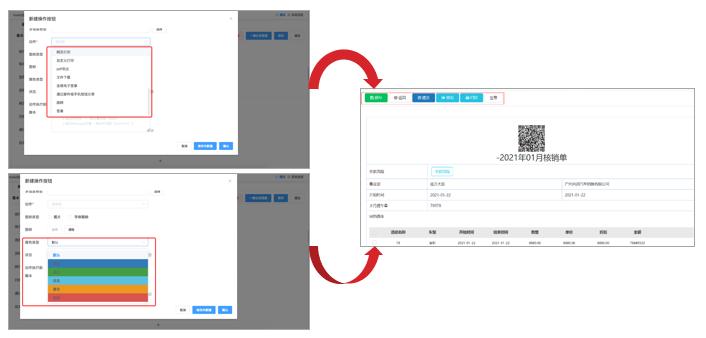丰富的表单操作按钮。提供流程启动、网页打印、电子签章、导出、导入等20多种功能控件;同时支持操作按钮的自定义,比如预警校验颜色等。