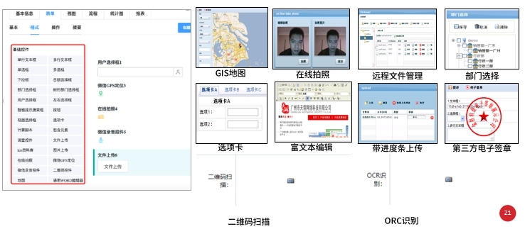 表单控件丰富。提供视图选择框、选项卡、主子表、在线编辑、二维码、拍照、视频、录音、定位等30多种功能控件;提供替换、查找、颜色、字体、等15种表单格式调整工具;封装覆盖98%软件开发需求;同时支持表单控件自定义。