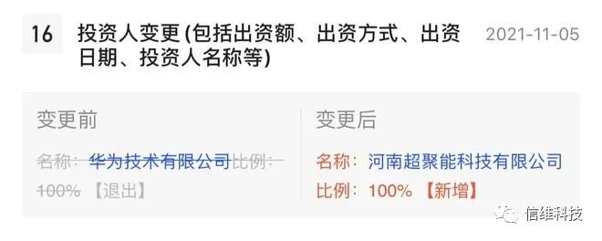 但从启信宝中查询可以看到,本次中标的超聚变数字技术有限公司原本由华为100%控股,但在2021年11月变为由河南超聚能科技有限公司(下称:超聚能)100%控股,而超聚能目前的三家股东均为国企。