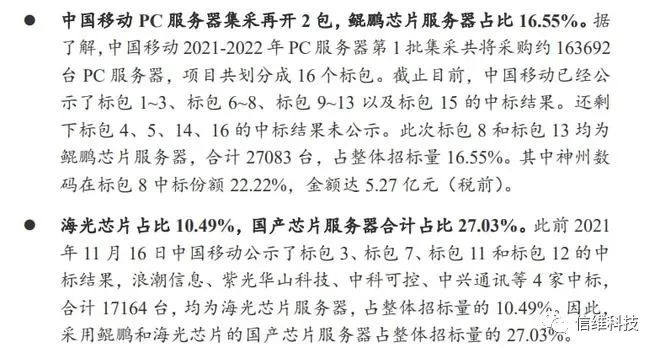 其他运营商方面,中国移动2021-2022年第1批PC服务器集采项目中,基于华为鲲鹏和海光处理器的国产芯片服务器累计达4.4万台,占整体招标量的比例为27.03%。