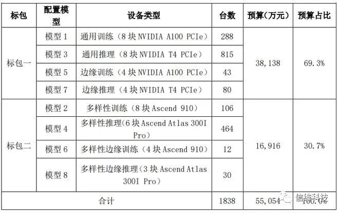 在2022年中国联通人工智能服务器集中采购项目中,标包二全部采用华为升腾系列,台数占比为33.3%,预算占比为30.7%。