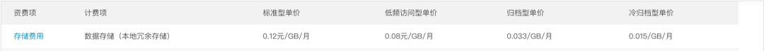 计算费用:0.000110592 元/GB-秒, 每个月有 40 万 GB-秒的免费额度,这项基本免费。 流量费用:函数请求响应流量:0.50 元/GB, 取决于您每个月从您的网盘上下载文件的多少, 上传没有流量费用。上传和下载均没有限速。 持久化费用:使用阿里云 NAS, 主要部署 kodbox 应用需要的 sqlite 数据库, 0.35(*结合低频介质,低至 0.19) GB/月, 由于 NAS 单价比较贵, 建议 NAS 盘只做 kodbox 的 sqlite 数据库存储, 不会超过1G, 费用即 0.35 元。 在单纯存储这块, 可以选择您自己存储类型,以使用 OSS 做文件存储为例, OSS 存储价格如下表, 如果电影收集爱好者, 大部分电影应该是冷归档型,假设有 100GB 的存储资源,那么每个月的存储费用是 1.5 元。