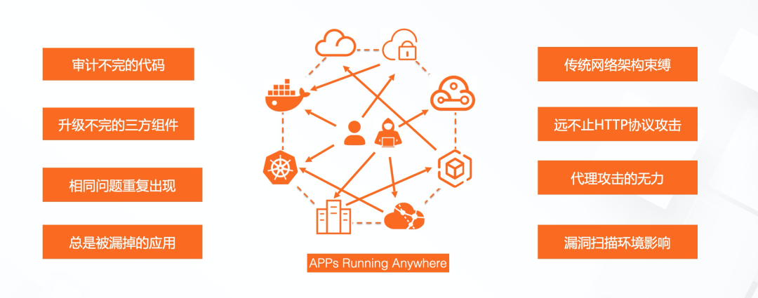 随着互联网成为日常生活的基础设施,企业的应用与服务遭受安全威胁和侵害的风险不断增加。这里面的风险不仅仅是网络层面的安全问题,更有应用本身的安全。在传统网络架构下,应用位于 IDC 内,有清晰的边界,应用威胁主要来自外部,边界内风险忽略不计,防护只需要关注边界入口处的南北向流量,传统上一般采用 WAF(即 web 应用防火墙)技术来拦截危险流量。但随着微服务及容器化等技术发展,应用可以在 IDC/容器/公有云/私有云等多环境下部署,针对应用的威胁除了南北向还有来自东西向的横向威胁。网络环境日益复杂及漏洞攻击手段多样化,都造成产研团队牵扯更多精力修复问题,从而浪费公司大量研发成本。