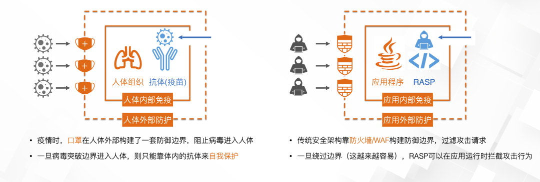 以人体病毒防护举例,我们通过口罩来隔绝外部病毒进入人体,防火墙通过分析识别阻隔外部危险流量来保护系统。而 RASP 技术类似于人体疫苗抗体无需关心病毒进入的途径,部署在在服务端点上伴随应用启动,可以直接识别并拦截攻击。RASP 旨在缩小应用安全安全测试和网络边界控制所留下的空白地带,深入应用运行环境内部,实时了解数据和事件流,以监测或者阻止开发过程中无法预见的新威胁。