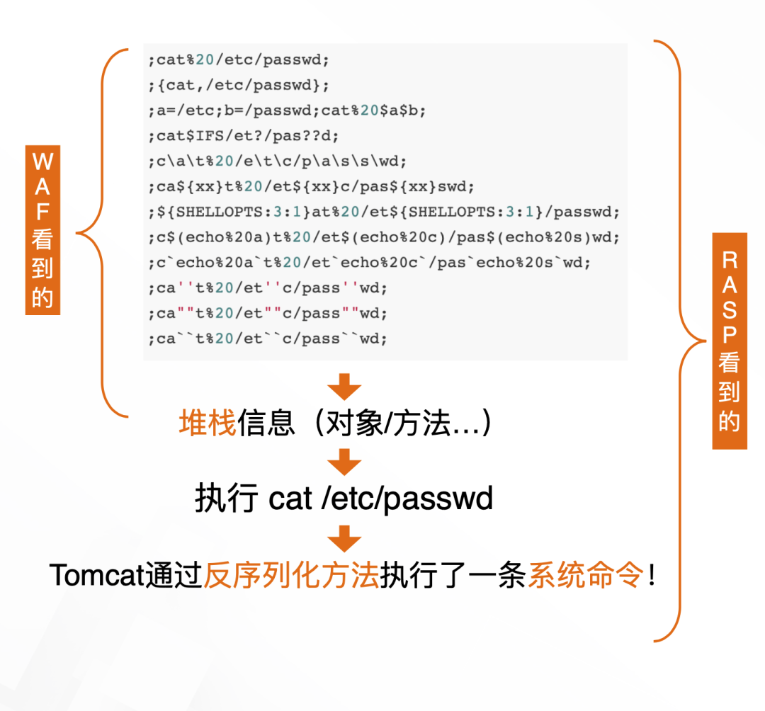 一般来说 WAF 在入口只能看到流量内容,即用户的原始请求,并不能感知应用最终会怎样执行这条请求。所以往往会产生一些误报漏报,例如用户在在线文档中上传一段 SQL 语句(误报)、利用PHP漏洞的报文打到了 JAVA 环境(虚报)、应用本身做过预编译,不存在 SQL 注入点(虚报)、ls 等短命令执行,极容易跟正常输入混淆(误报)。