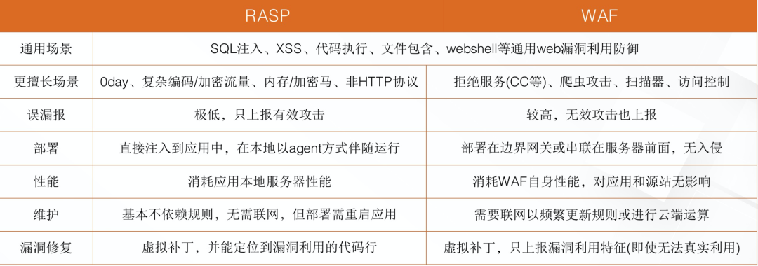 - RASP 基本不依赖规则,无需联网,极少更新,反之 WAF 依赖规则需要联网更新或者进行云端运算