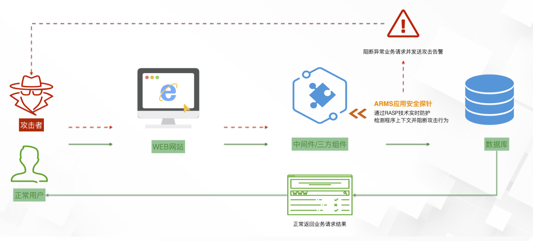 如果我们的应用本身是否可以直接被加固,无需代码安全专家,无需额外代码修改,也无需复杂配置?对此,阿里云应用实时监控服务 ARMS 推出基于 RASP 的"应用安全"功能,让应用具备高水位的运行时安全防护,实现内生安全。