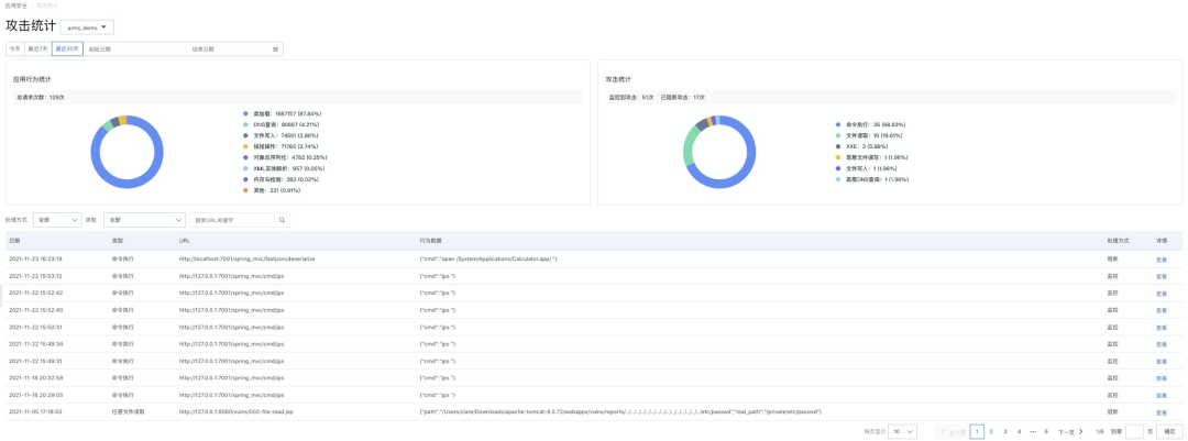 ARMS 应用安全在攻击统计页面,提供了应用正常行为统计以及攻击行为统计数据,方便您了解近期是否存在攻击事件。如果被检测到攻击,在该页面还可以分页查看攻击发生时间、攻击类型、请求 URL、上下文数据以及本次攻击的处理结果(监控还是拦截取决于您的防护设置);点击详情可以查看攻击来源 IP、请求详细参数、机器等信息,通过分析代码堆栈进一步定位到代码漏洞位置进行修复。