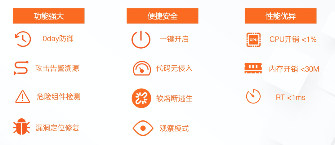 结合以上案例,我们可以看到 ARMS 应用安全的整体产品优势,ARMS应用安全全面支持 0day 防御,攻击告警以及溯源,支持危险组件检测,并提供漏洞修复建议。一键开启接入,无需修改代码,支持软熔断逃生避免影响应用以及观察模式体验实际效果。通过压测来看,开启应用安全防护模式后 CPU 平均开销增加低于 1%,内存占用低于 30M,平均 RT 耗时毫秒级,对系统性能影响极低。通过防护设置您可以选择观察/拦截模式、自定义勾选攻击检测类型、自定义检测超时时间,进一步降低性能影响。通过集成 ARMS 应用安全运行时自我防护能力,为您的应用注入"疫苗",实现应用默认安全,抵御日常 OWASP 攻击,默认防御 fastjson 等新漏洞(0day)以及内存马,加密马等。还可以自动发现三方组件高危漏洞,溯源攻击行为精准定位修复问题。一键开关,稳定低消耗运行,运维无负担,为您的业务安全保驾护航!