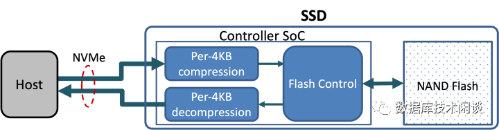 Hardware-based data compression capability becomes increasingly more widely available on modern storage devices and infrastructure, e.g., commercial solid-state drives (SSDs) with built-in transparent compression are emerging [8], most all-flash arrays (AFAs) [2, 4, 6] transparently compress their data, and Cloud vendors have started to integrate hardware-based compression capability into their storage infrastructure (e.g., Microsoft Corsia [1]). Fig. 1 illustrates an SSD with built-in transparent compression: Its controller chip performs compression or decompression on each 4KB LBA (logical block address) block along the I/O path, which is transparent to the host that accesses the SSD as a normal block device through standard interface (e.g., NVMe).