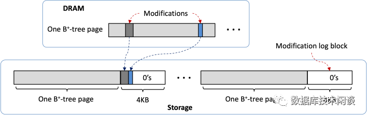 This is motivated by a simple observation: For a B+-tree page, let Δ denote the difference between its in-memory image and on-storage image. If the difference is significantly smaller than the page size, we can largely reduce the write amplification by logging the page modification Δ, instead of writing the entire in-memory page image, to the storage device. Unfortunately, when a B+-tree runs on normal storage devices without built-in transparent compression, this approach is not practical due to significant operational overhead: Given the 4 KB block IO interface, we must coalesce multiple Δ’s from different pages into one 4 KB LBA block in order to materialize the write amplification reduction. To enhance the gain, we should apply the page modification logging multiple times for each page, before resetting this process to construct the up-to-date on-storage page image. Accordingly, multiple Δ’s associated with the same page will spread over multiple 4 KB blocks on the storage device, which however will increase the data management complexity and page read latency. As a result, this simple design concept has not been used by real-world B+-tree implementations reported in the open literature.