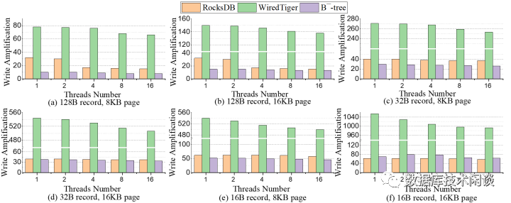 For the demonstration purposes, we implemented a B+-tree that incorporates the above method for reducing write amplification. The resulting implementation is referred to as B--tree. For comparison, RocksDB and WiredTiger were used as representatives of LSM-tree and normal B+-tree. In all the experiments, each record is generated by filling half its content as all-zero and the other half content as random bytes in order to mimic the runtime data content compressibility. Fig. 6 shows the measured write amplification under a 500 GB dataset, where all the cases use 15 GB cache memory. In each experiment, we use either 1, 2, 4, 8, or 16 client threads to cover a wide range of runtime workload concurrencies. Compared with RocksDB, WiredTiger has a much larger write amplification, while B--tree can essentially close the B+-tree vs. LSM-tree write amplification gap. For example, in the case of 32 B record size and 4 client threads, the write amplification of RocksDB is 38, while the write amplification of WiredTiger is 268 under 8 KB page size and 530 under 16 KB page size, respectively, which are 7.1x and 13.9x larger than that of RocksDB. In comparison, the write amplification of B--tree is 28 under 8 KB page size (which is only 73.7% of RocksDB’s write amplification) and 36 under 1 6KB page size (which is almost the same as RocksDB).