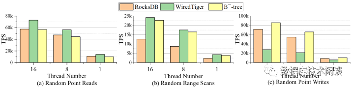 Finally, Fig. 7 shows the measured speed performance under three different workloads: (a) random point reads, (b) random range scans, and (c) random point writes. As shown in Fig. 7(a), normal B+-tree (i.e., WiredTiger) has the best point read TPS (transactions per second) performance, while RocksDB and B--tree achieve almost the same random point read TPS performance. For example, under 16 client threads, WiredTiger can achieve 71K TPS, while RocksDB qnd B--tree can achieve 57K TPS, about 19.7% less than that of WiredTiger. Fig. 7(b) shows the measured TPS when running random range scan queries, where each range scan covers 100 consecutive records. Compared with the case of random point reads, WiredTiger and B--tree have noticeably smaller difference in terms of range scan throughput performance. This is because the two overheads of B--tree (i.e., fetching an extra 4KB, and in-memory page reconstruction) can be amortized among the records covered by each range scan. In comparison, RocksDB has noticeably worse range scan throughput performance than the other two, because range scan invokes reads over all the levels in LSM-tree, leading to a high read amplification. Fig. 7(c) shows the performance under random point write workloads. The random write speed performance of B+-tree and LSM-tree is fundamentally limited by the write amplification. Therefore, by significantly reducing the write amplification, B--tree could achieve much higher write speed performance. As shown in Fig. 7(C), B--tree achieves 19% higher write throughput than RocksDB, and about 2.1x higher write throughput than WiredTiger. More comprehensive experimental results are available in our FAST’22 paper [7].