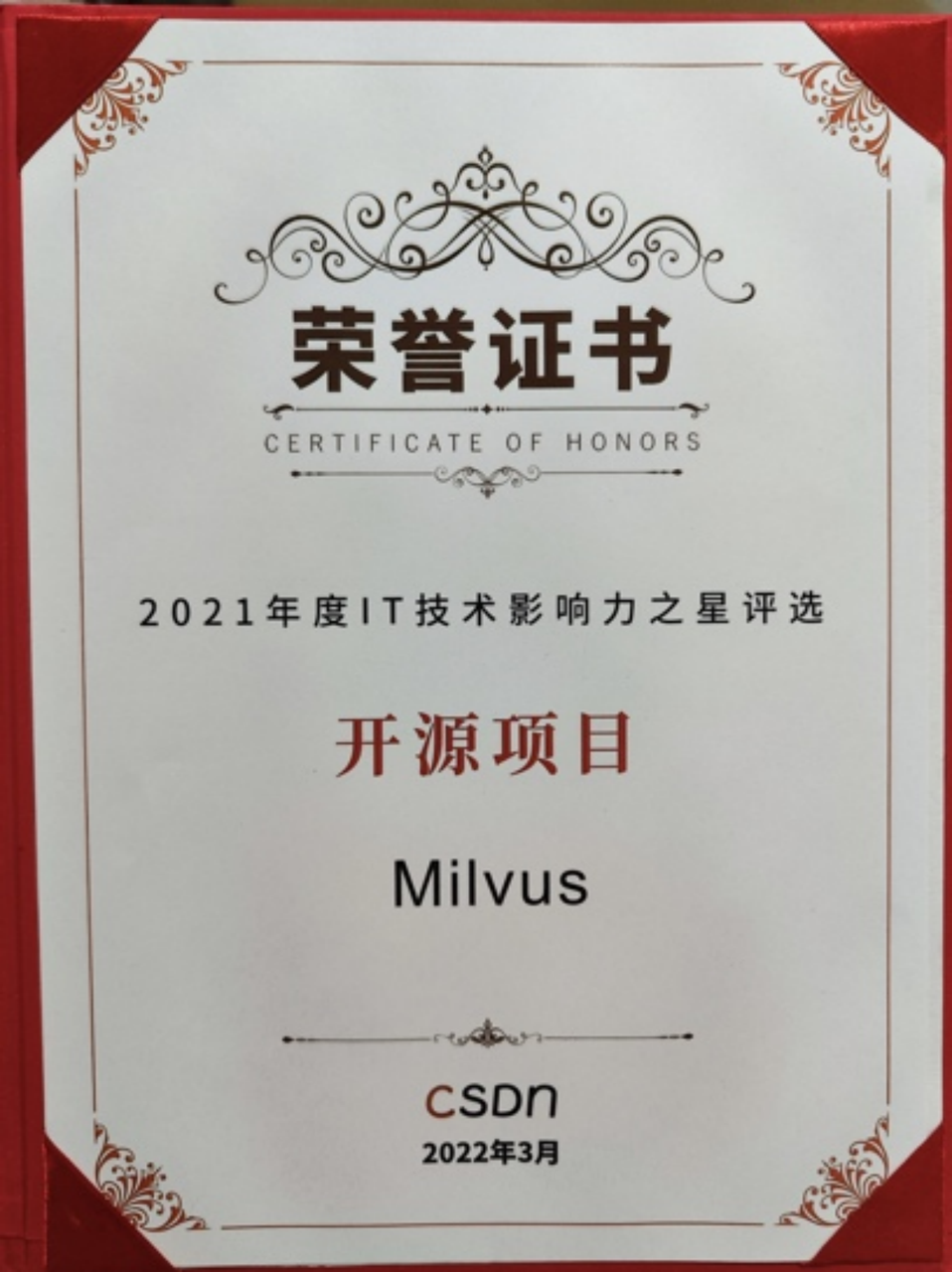 “IT 技术影响力之星” 评选自 2021 年 12 月 6 日启动,经个人/企业提名、业界专家推荐评审,历经五个月,评选出各类奖项。此次 Milvus 上榜,代表了行业和用户对 Zilliz 在技术创新和开发者生态建设上的认可 。Milvus 项目自 2019 年开源以来受到广大开发者的持续关注和喜爱,是全球顶级开源 AI 基金会 LF AI & Data 旗下最活跃的项目。2021 年 Milvus 向量数据库技术帮助每家企业平均降低 AI 应用研发成本 35%,创造社会效益超过 10 亿美金,成功推动了全球 AI 生产应用民主化进程。