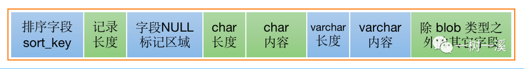。varchar 长度:varchar 字段内容长度,占用 1 字节或 2 字节。 varchar 内容:varchar 字段实际内容。 除 blob 类型之外的其它字段:指是的除 tinyblob、mediumblob、blob、longblob、tinytext、mediumtext、text、longtext、json、geometry 之外的其它类型,只需要把字段内容写入排序缓冲区,不需要写入字段长度。 重点说明: 如果某个字段内容为 NULL,该字段在 字段 NULL 标记区域