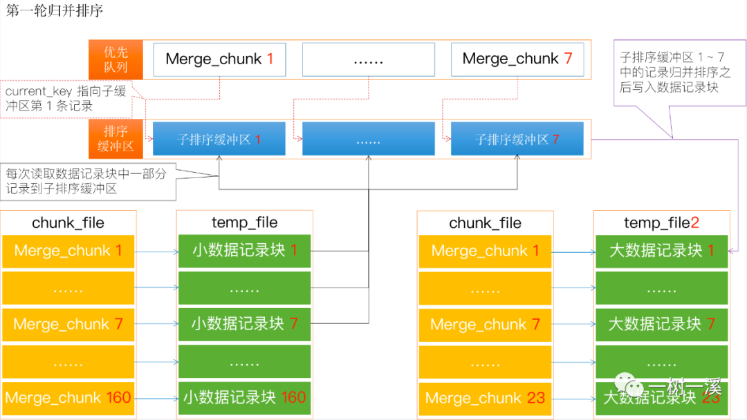 左下角 chunk_file 中有 160 个 Merge_chunk,temp_file 有 160 个对应于 Merge_chunk 的数据记录块