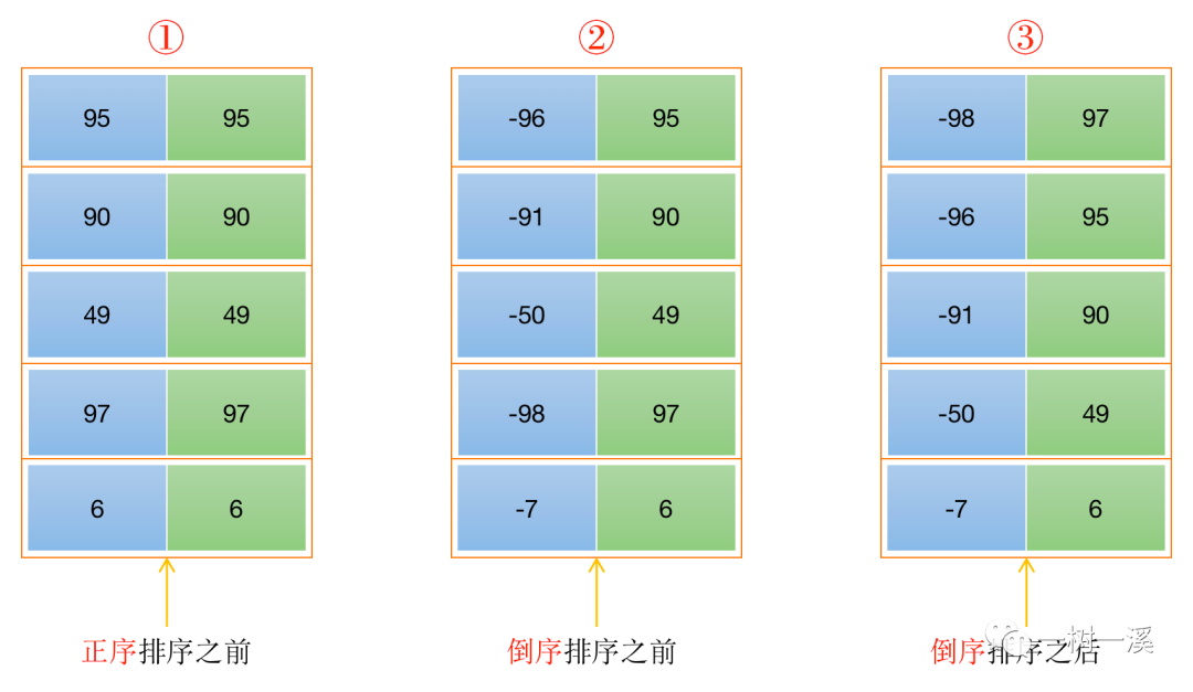 从 3 号图示可见,倒序排序时,对排序字段值取反之后按照正序排序,最终实现了记录的倒序排序