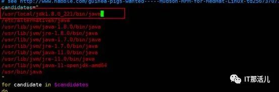 vim /etc/rc.d/init.d/Jenkinscandidates="/usr/local/jdk1.8.0_221/bin/java/etc/alternatives/java/usr/lib/jvm/java-1.8.0/bin/java/usr/lib/jvm/jre-1.8.0/bin/java/usr/lib/jvm/java-1.7.0/bin/java/usr/lib/jvm/jre-1.7.0/bin/java/usr/lib/jvm/java-11.0/bin/java/usr/lib/jvm/jre-11.0/bin/java/usr/lib/jvm/java-11-openjdk-amd64/usr/bin/java"