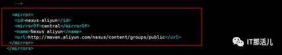 vim usr/local/apache-maven-3.6.1/conf/settings.xml<mirror> <id>nexus-aliyun</id> <mirrorOf>central</mirrorOf> <name>Nexus aliyun</name> <url>http://maven.aliyun.com/nexus/content/groups/public</url> </mirror>