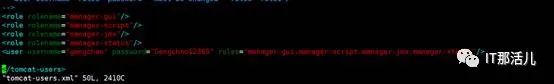 vim tomcat-users.xml<role rolename="manager-gui"/><role rolename="manager-script"/><role rolename="manager-jmx"/><role rolename="manager-status"/><user username="gengchao" password="Gengchao12369" roles="manager-gui,manager-script,manager-jmx,manager-status"/>