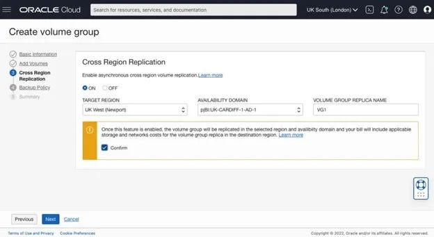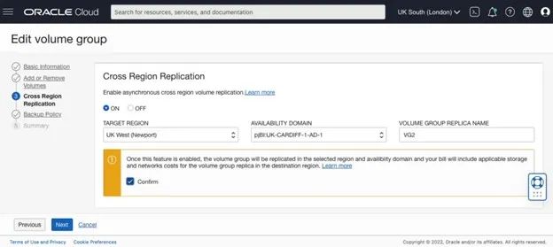 在 Cross Region Replication 部分中,选择 ON,然后选择要将卷组复制到的区域、放置卷组副本的可用性域以及目标区域中卷组副本的名称。