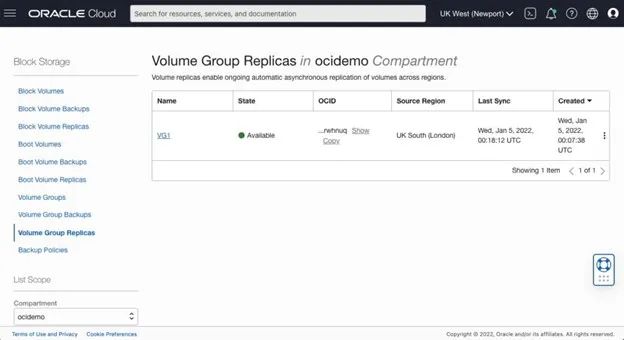 OCI 块存储卷组使您能够对应用程序崩溃和时间一致管理所需的所有数据和启动卷进行分组,并提供协调备份和直接磁盘到磁盘克隆。通过此功能更新,组中的所有卷也得到协调,并使用反映同一时间点的数据复制到您选择的另一个区域。