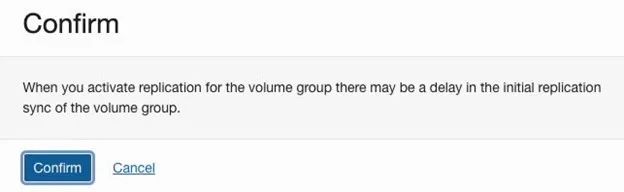 选中 CONFIRM 以确认与复制相关的成本警告,单击 Next,并根据需要配置备份策略。在摘要步骤中,单击创建。卷组创建并可用后,复制立即开始。