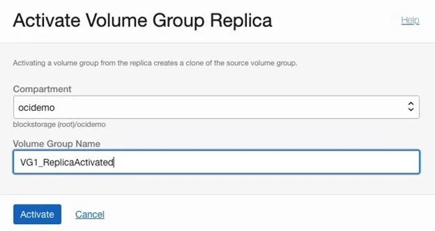 在“激活卷组副本”对话框中,指定新卷组的设置,包括名称和隔离专区。然后单击激活。