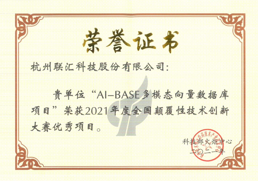 2021年12月,在国家科学技术部主办的首届“全国颠覆性科技大赛”中,联汇“AI-BASE多模态向量数据库项目”从大赛近3000个项目中脱颖而出,获评优秀项目。