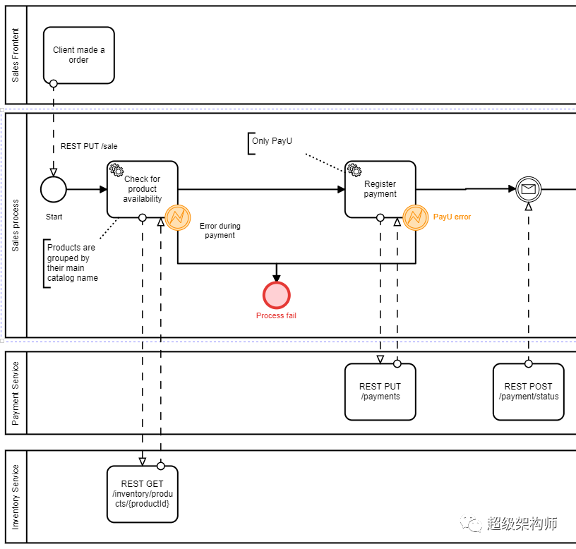 现在,让我们试着设身处地为业务分析师着想。当试图仅使用主通道(示例图中的销售流程)来理解流程时,我们根本不知道这两个服务任务究竟做了什么。可以有一个逻辑调用内部数据库,或者从缓存中访问数据,或者从初始过程数据中计算一些东西。但是当所有部分都存在时,我们清楚地看到这些步骤调用了外部系统。我们甚至知道他们对外部系统使用了哪些特定的 REST 请求!
