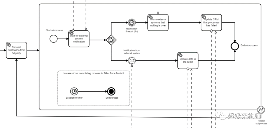 最后,我们应该考虑进程超时的问题。在实际的行业案例中,大多数流程都应该有一个计时器,当客户没有反应时,它会结束它们。没有它,未完成流程的数量可能会不断增长,并扩展到数十万个。在大多数示例中,计时器仅分配给人工任务。这是一种有效且常见的方法,但是当我们需要在每一步都升级时怎么办?或者计时器应该是全局的?在这种情况下,全局处理程序或升级处理程序应该使用 BPMN 流程而不是纯粹的编程方法来建模,以便为业务分析师提供更清晰的信息。