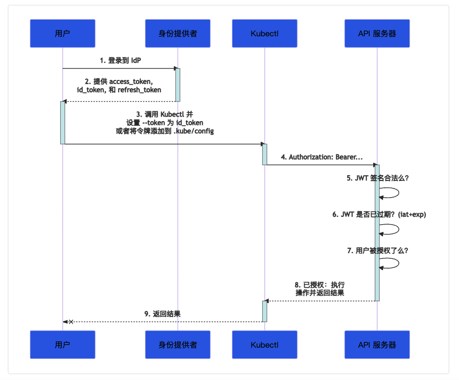 在 Kubernetes 中 OpenID Connect 的认证流程如下: