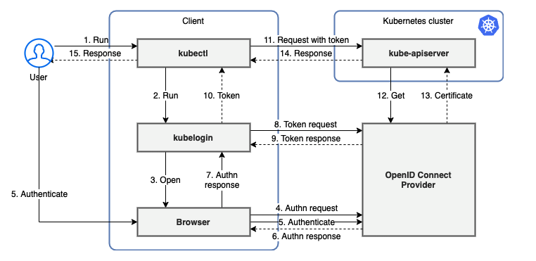 参数中。好在社区提供了 kubelogin 插件可以解决这一繁琐的问题,kubelogin 是一个用于 Kubernetes OpenID Connect 进行身份认证的插件,也称为 kubectl oidc-login。当运行 kubectl 命令时,kubelogin 会打开浏览器,用户需要输入用户名和密码登录程序,认证通过后,kubelogin 会从认证服务器获取一个令牌,然后 kubectl 就可以使用该令牌和 API Server 进行通信,具体的流程图如下: