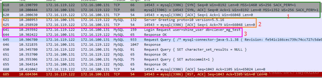 在本文的测试中,只用了 5 行代码来建立连接,但是并没有通过该连接去执行任何操作,所以在程序执行完毕之后,连接不是通过 Connection.close() 关闭的,而是由于程序执行完毕,导致进程终止,造成与数据库的连接异常关闭,所以最后会出现 TCP 的 RST 报文。