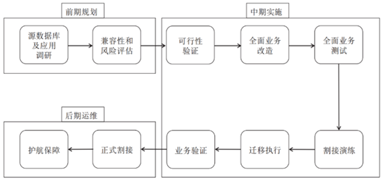 数据库迁移的工程按照进度可以划分为前期规划、中期实施和后期运维3个阶段,具体可以分为源数据库及应用系统调研、兼容性和风险评估、可行性验证、全面业务改造、全面业务测试、割接演练、迁移执行、业务验证、正式割接和护航保障10个关键环节,如下图
