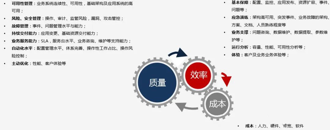 运维狭义“运维技术与资源”可以定义为“监、管、控”,技术与资源主要是支撑运维/运营的质量、效率、成本的平衡。以下简单摘录了运维的一些能力要求: