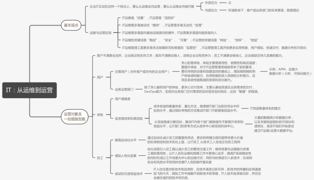 优锘科技CEO的陈傲寒在2016年写过一篇文章《IT:从运维到运营》,仍是我读过最好的一篇。全文从企业、运维组织角度出发分析什么是运维、什么是运营,再将运营分解到不同角色上的理解与落地的方向,全文均是干货,值得通读,这里只列出一个思维导图。