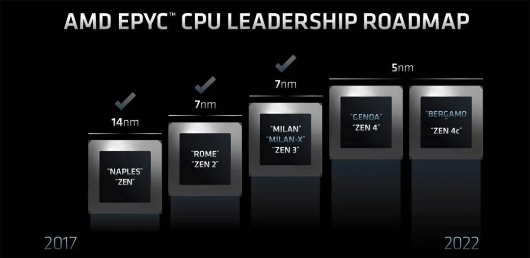 根据AMD路线图显示,2022年,AMD将会正式推出第4代EPYC处理器——Genoa和Bergamo。两块处理器将会采用5nm制程工艺,支持12通道DDR5内存,频率高达5200MHz。此外还有高达128条PCIe 5.0通道,其中每条通道的带宽是目前PCIe 4.0的两倍。基于 PCIe 5.0,第4代EPYC 处理器还支持Compute Express Link (CXL)通信协议。