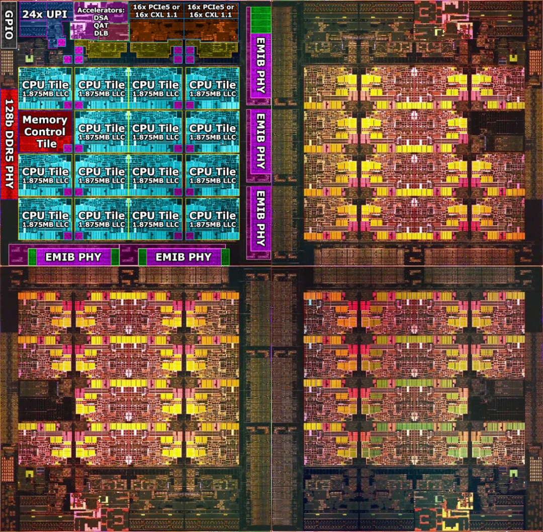 Intel在去年架构日上公布了第4代至强处理器Sapphire Rapids,根据相关爆料,Sapphire Rapids采用小芯片封装,内部集成四个Die,彼此通过EMIB桥接互连,核心使用Golden Cove架构,采用10nm Enhanced SuperFin工艺制造,最高规格为56核,拥有支持CXL1.1的128条PCIe 5.0通道和8通道DDR5内存。